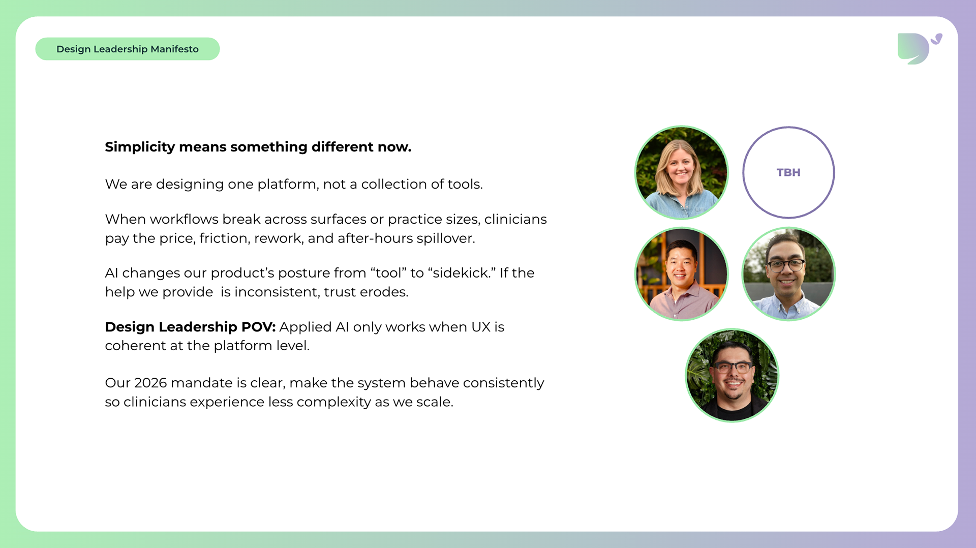 Below are some of the highlights from the 2026 Design Vision deck my leadership team and I created for SimplePractice's Product Design organization.